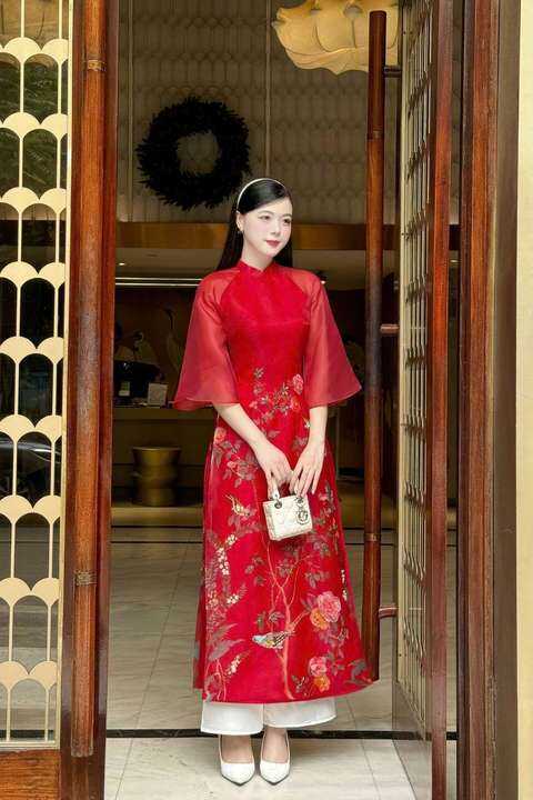 Áo dài cách tân nữ đỏ đính kết chất liệu tơ sống mềm mại duyên dáng – AN41