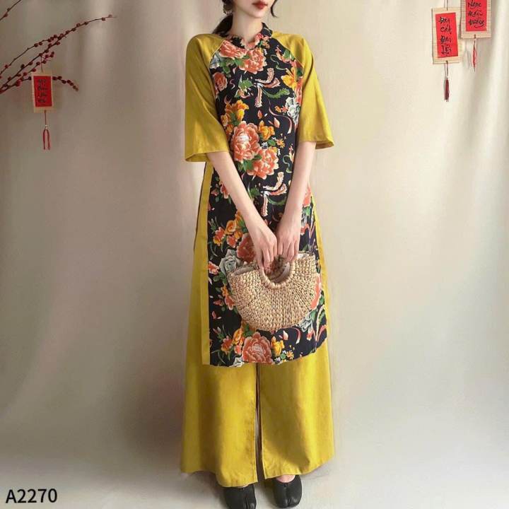 Bộ áo dài truyền thống cách tân (Hoa văn thời bao cấp cá tính – tay trơn)